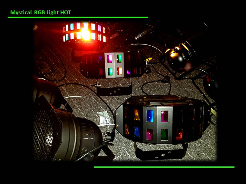 Mystical RGB Licht ist ein Strahler mit einem Abstrahlwinkel von 120°, ausgestattet mit mehreren farbigen Linsen. Außerdem mit einem Halogen Leuchtmittel. Die Strahler arbeiten mit einem Heißlichtdimmer.